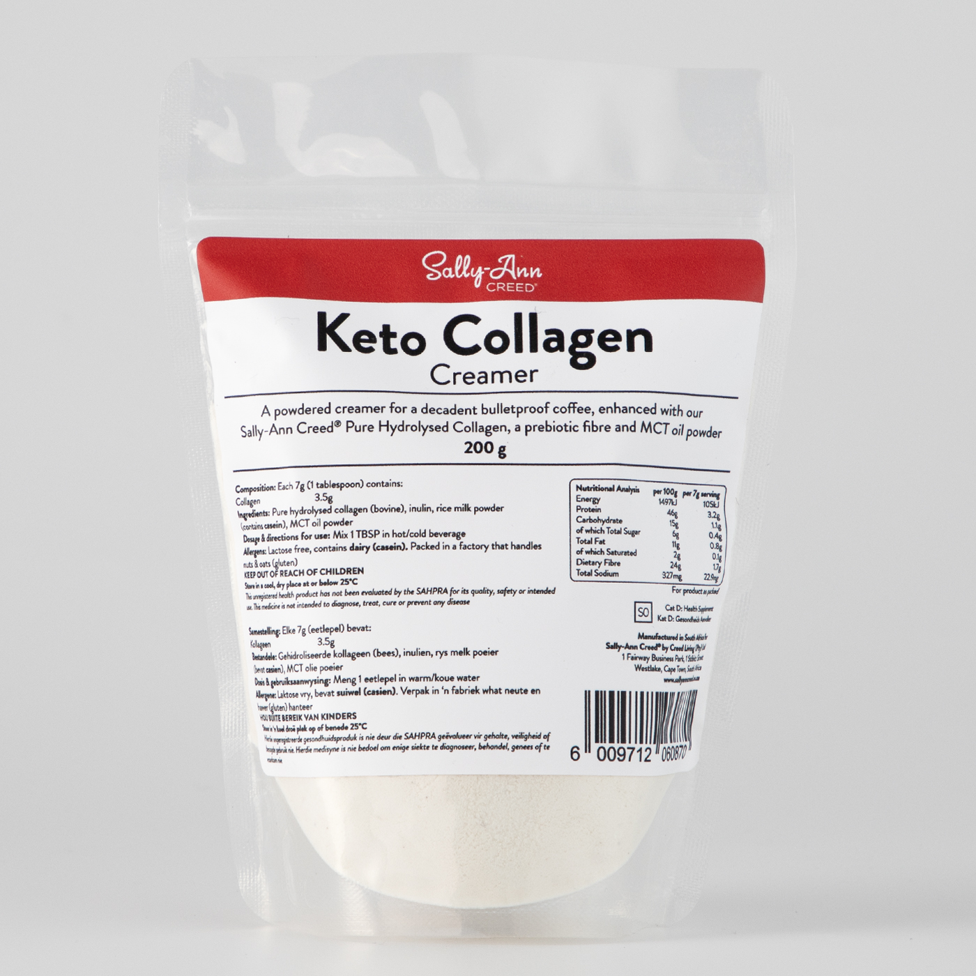 A powdered keto creamer that is made with Pure Hydrolysed Collagen and the addition of organic MCT oil powder, rice milk powder and a powerful prebiotic fibre.